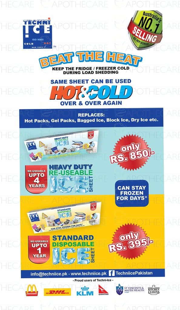 - Electricity: During blackouts for taking Techni Ice from the freezer & placing in the refrigerator to keep refrigerator cold while electricity is off.