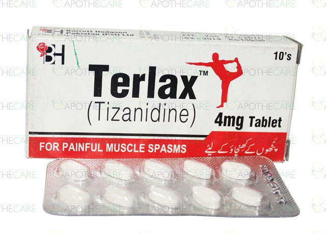 Product Name: Terlax Tab 4mg 10'sProduct Form: TabletsPack Size: 10'sMarketed By: BARRETT HODGSON PAKISTAN (PVT) LTDGeneric Category: Muscle Relaxant Ingredients: Tizanidine