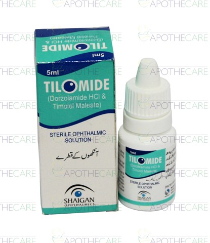 Product Name: Tilomide Ophthalmic Sol 5mlProduct Form: Ophthalmic SolutionPack Size: 5mlMarketed By: Shaigan PharmaceuticalsGeneric Category: Anti-GlaucomaIngredients: Dorzolamide 2%w/v, Timolol (Maleate) 0.5%w/v