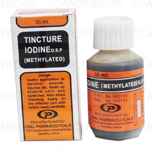 Product Name: Tincture Iodine 30mlProduct Form: LiquidPack Size:30mlMarketed By: Oval PharmaGeneric Category: ANTISEPTICIngredients: Iodine
