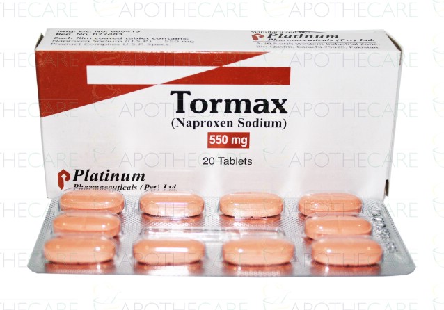 Product Name: Tormax Tab 550mg 2x10'sProduct Form: TabletPack Size: 2x10'sMarketed By: Platinum Pharmaceuticals (Pvt) LtdGeneric Category: NSAIDIngredients: Naproxen