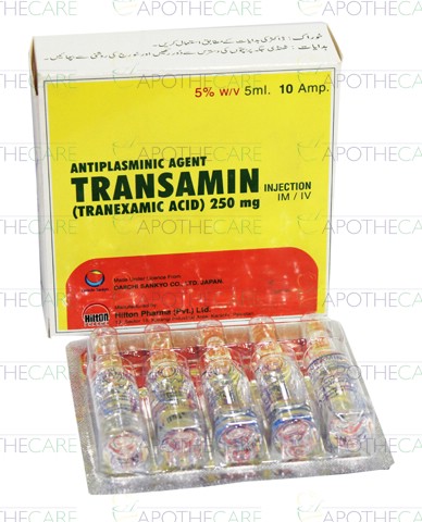 Product Name: Transamin Inj 250mg 10Ampx5mlProduct Form: InjectionPack Size: 10Ampx5mlMarketed By: Hilton Pharma (Pvt) Ltd.Generic Category: Anti-FibrinolyticIngredients: Tranexamic Acid