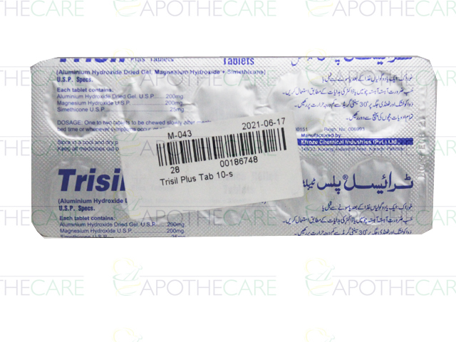 Product Name: Trisil Plus Tab 500'sProduct Form: TabletsPack Size: 10'sMarketed By: Efroze Chemical Industries (Pvt) LtdGeneric Category: AntacidIngredients: Aluminium Hydroxide gel 200mg, Magnesium Hydroxide 200mg, Simethicone 25mg