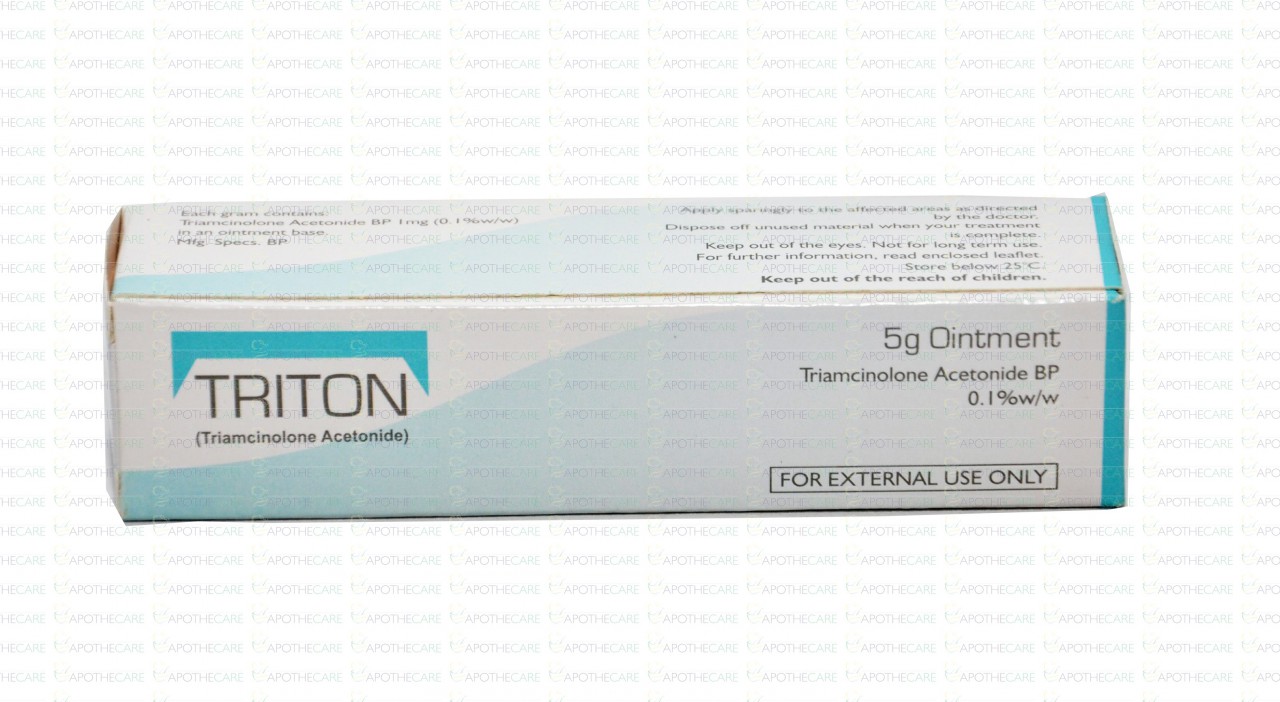 Product Name: Triton Oint 0.1% 5gProduct Form: OintmentPack Size: 5gMarketed By: PHARMA HEALTH PAKISTAN (PVT.) LTDGeneric Category: CorticosteroidIngredients: Triamcinolone Acetonide