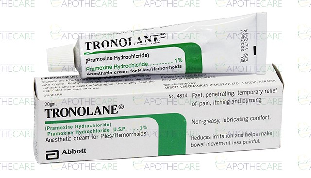 Product Name: Tronolane Cream 1% 20gProduct Form: CreamPack Size: 20gMarketed By: ABBOTT LABORATORIES (PAKISTAN) LTDGeneric Category: Anti-hemorrhoidalIngredients: Pramoxine Hydrochloride