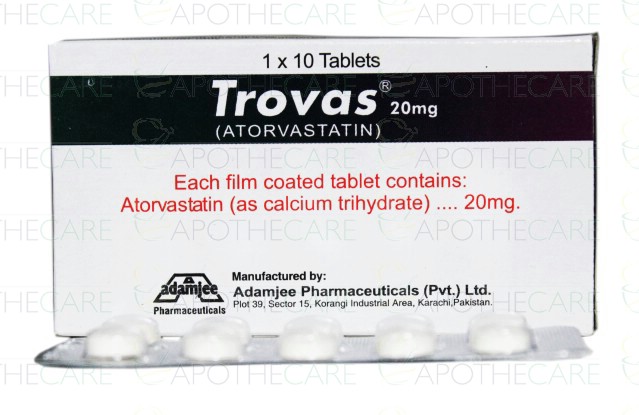 Product Name: Trovas Tab 20mg 1x10'sProduct Form: TabletsPack Size: 1x10'sMarketed By: Adamjee Pharma ServicesGeneric Category: StatinsIngredients: Atorvastatin