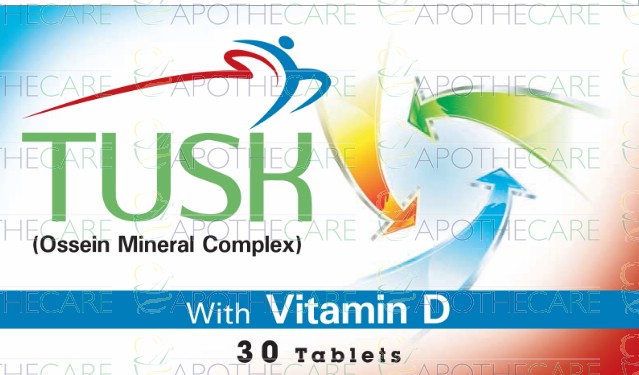 Product Name: Tusk Tab 830mg/400iu 30'sProduct Form: TabletsPack Size: 30'sMarketed By: MAARK PHARMAGeneric Category: MINERALS SUPPLEMENT Ingredients: OSSEIN MINERAL COMPLEX 830mg & VITAMIN-D 400IU