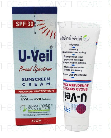 Product Name: U-Veil Cream 60gProduct Form: CreamPack Size: 60gMarketed By: Derma Techno PakistanGeneric Category: Skin Care PreparationsIndications: New Technology 100% mineral wide spectrum of protection against UVA+ UVB + IR.