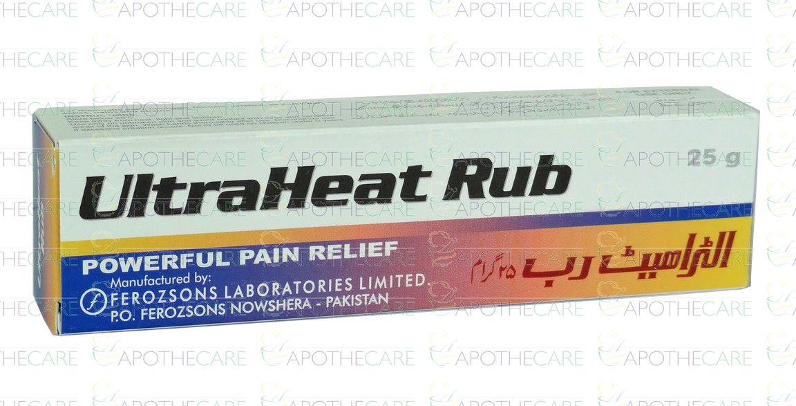 Product Name: Ultraheat Rub Cream 25gProduct Form: CreamPack Size: 25gMarketed By: FEROZSONS LABORATORIES LTDGeneric Category: NSAIDIngredients: Methyl Salicylate, Menthol, Eucalyptus, Turpentine Oil