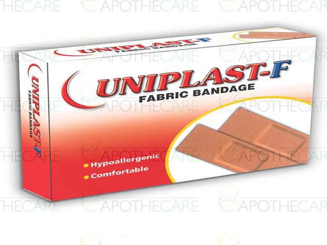 Product Name: Uniplast-F Fabric Bandage 20'sProduct Form: BandagesPack Size: 20'sMarketed By: UniferozIndicationss: Protects small cuts, wounds, scrapes, blisters, insect bite and other minor injuries, and promotes natural healing process