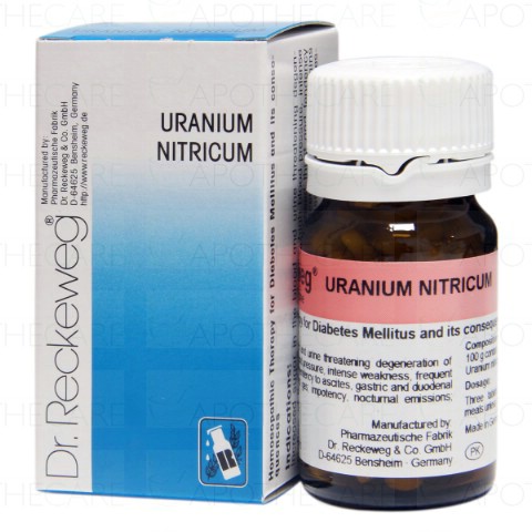 Indications: Uranium Nitricum is a traditional homoeopathic remedy used in treating diabetes mellitus and its associated symptoms. Dosage: 3 tablets 3 times daily 15 minutes before meals.