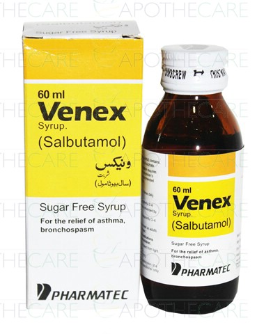 Product Name: Venex Syp 2mg/5ml 60mlProduct Form: SyrupPack Size: 60mlMarketed By: PharmatecGeneric Category: B2 StimulantIngredients: Salbutamol