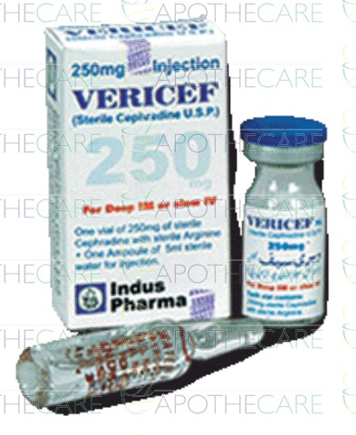 Product Name: Vericef Inj 250mg 1VialProduct Form: InjectionPack Size: 1VialMarketed By: INDUS PHARMA (PVT) LTDGeneric Category: CEPHALOSPORIN ANTIBIOTICIngredients: Cephradine
