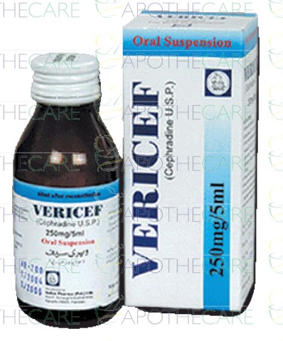 Product Name: VERICEF Susp 250mg/5ml 60mlProduct Form: SuspensionPack Size: 60mlMarketed By: INDUS PHARMA (PVT) LTDGeneric Category: CEPHALOSPORIN ANTIBIOTICIngredients: Cephradine