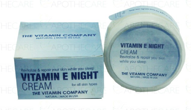 Product Name: Vitamin E Night Cream 40gmProduct Form: CreamPack Size: 40gmMarketed By: The Vitamin CompanyGeneric Category: Skin care preparations Ingredients: Natural Vitamin E