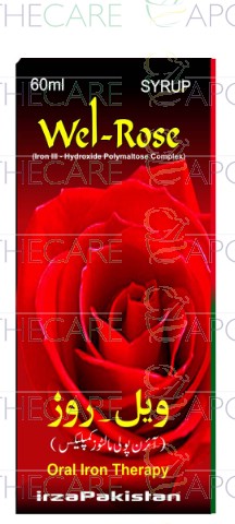 Product Name: Wel-Rose Syp 50mg/5ml 60mlProduct Form: SyrupPack Size: 60mlMarketed By: IRZA PHARMA PVT LTDGeneric Category: ANTI-ANEMICIngredients: Iron (III) Hydroxide Polymaltose Complex