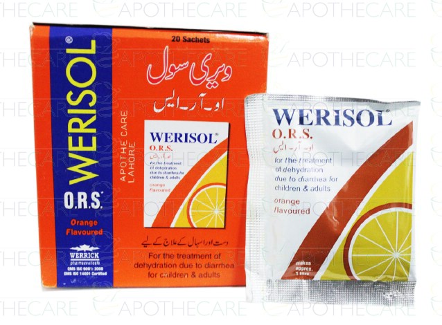 Product Name: Werisol Powder Sachet 20'sProduct Form: PowderPack Size: 20'sMarketed By: Werrick PharmaceuticalsGeneric Category: Rehydration FluidsIngredients: Oral Rehydration Solution