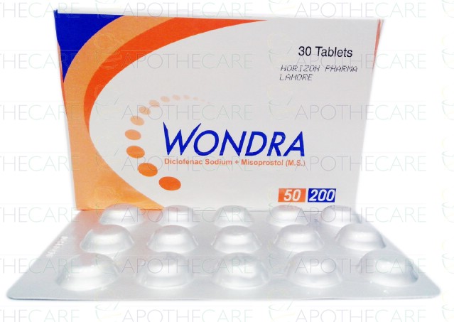 Product Name: Wondra Tab 50mg/200mcg 2x15'sProduct Form: TabletsPack Size: 2x15'sMarketed By: Wilshire Laboratories (Pvt) LtdGeneric Category: NSAID Induced UlcerIngredients: Diclofenac Sodium 50mg, Misoprostol 200mcg