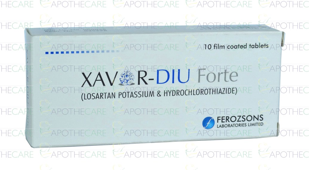 Product Name: Xavor-DIU Forte Tab 100mg/25mg 10'sProduct Form: TabletPack Size: 10'sMarketed By: FEROZSONS LABORATORIES LTDGeneric Category: Anti-HypertensiveIngredients: Losartan Potassium 100mg, Hydrochlorothiazide 25mg