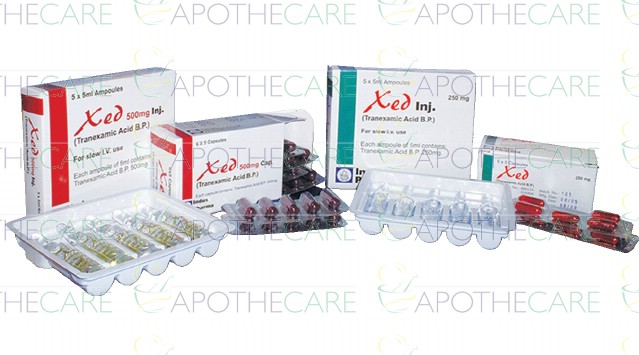 Product Name: Xed Cap 250mg 5x6'sProduct Form: CapsulesPack Size: 5x6'sMarketed By: INDUS PHARMA (PVT) LTDGeneric Category: ANTI-FIBRINOLYTICIngredients: Tranexamic acid