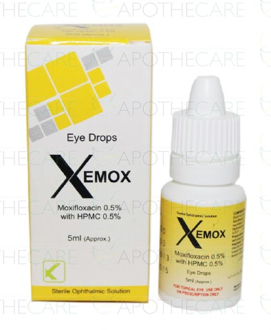 Product Name: Xemox Opthalmic Sol 5mlProduct Form: DropsPack Size: 5mlMarketed By: KOBEC HEALTH SCIENCESGeneric Category: Anti-InfectiveIngredients: Moxifloxacin 0.5%, HPMC 0.5%