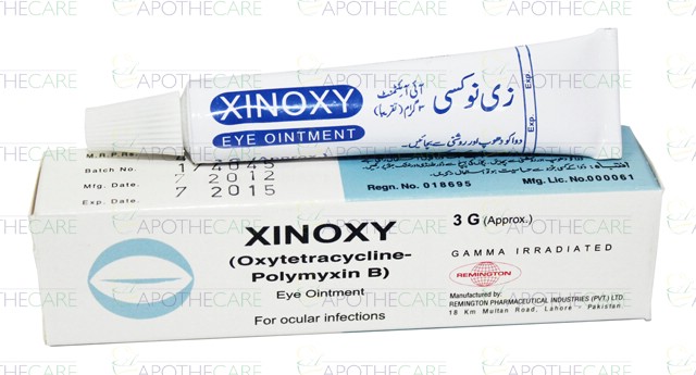 Product Name: Xinoxy Eye Oint 3gProduct Form: OintmentPack Size: 3gMarketed By: Remington PharmaceuticalsGeneric Category: Anti-InfectiveIngredients: Oxytetracyline Hydrochloride 5mg, Plolymyxin B 10,000 units