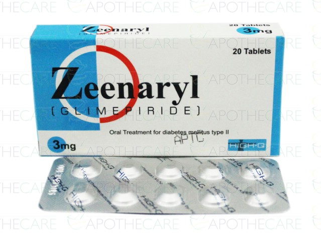 Product Name: Zeenaryl Tab 3mg 20'sProduct Form: TabletsPack Size: 20'sMarketed By: High Q PHARMACEUTICALSGeneric Category: Oral HypoglycemicIngredients: Glimepiride