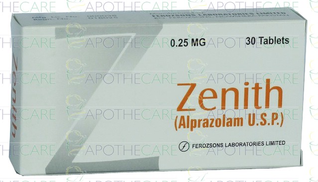 Product Name: Zenith Tab 0.25mg 3x10'sProduct Form: TabletPack Size: 3x10'sMarketed By: FEROZSONS LABORATORIES LTDGeneric Category: TranquilizerIngredients: Alprazolam